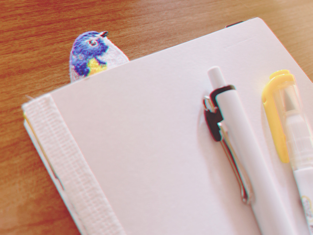 そして、手帳について、ここでブログを書いたりSNSを使ったりしてはいるものの、もっと日常的にその時感じたことや考えたことを残せてぱっと見返せるものがほしくて始めてみました。今までも手帳に挑戦しては挫折してきているのですが、今回は続けられそうな気がしています。手帳は挫折したときのものを再利用して、バレットジャーナルとコモンプレイスという手帳術を使って書いています。私がやっているのはそれをもっと雑に適当にしたものですが。バレットジャーナルはやる事・やりたい事の管理に、コモンプレイスはとにかく何でも書いてみてあとでブログでカテゴリ分けやタグ付けをするような感覚でマークをつける、といった感じでやっています。検索かければちゃんとしたやり方を詳しく解説している動画などもあるので気になった方はぜひ。手帳のフォーマットもなんですが、まず書くハードルを下げるためにカバーを外しました。ぱっと開けないと書かなくなっちゃんですよね…。ということでむきだしの手帳。はさんでいるのはルリビタキのしおりです。