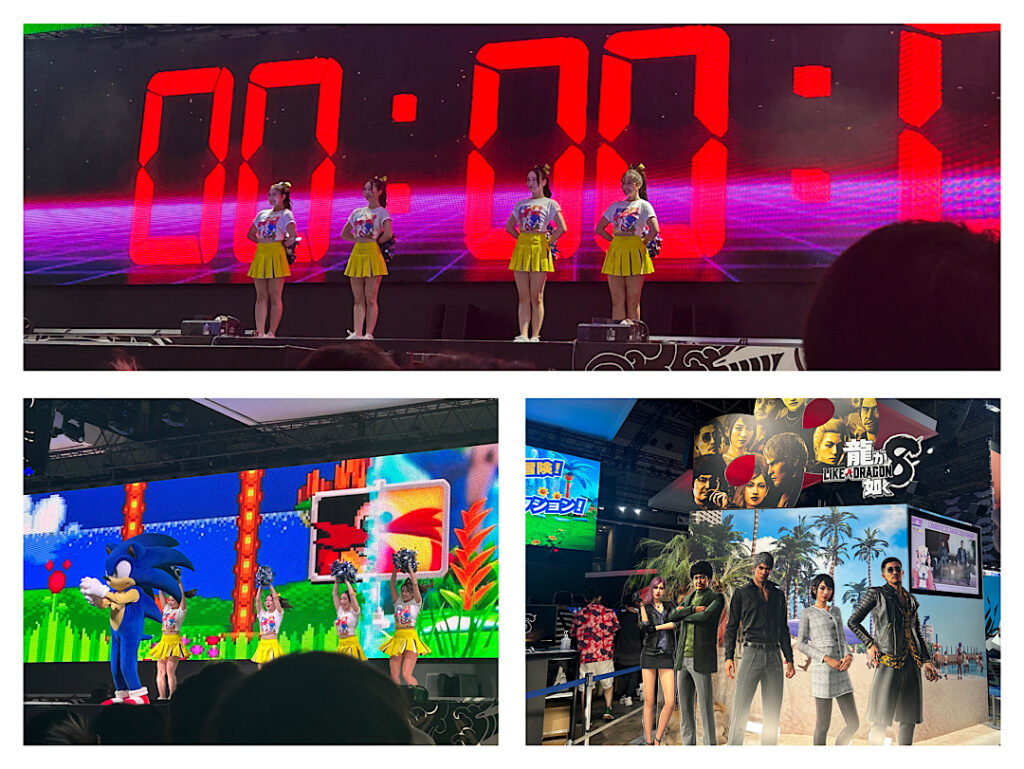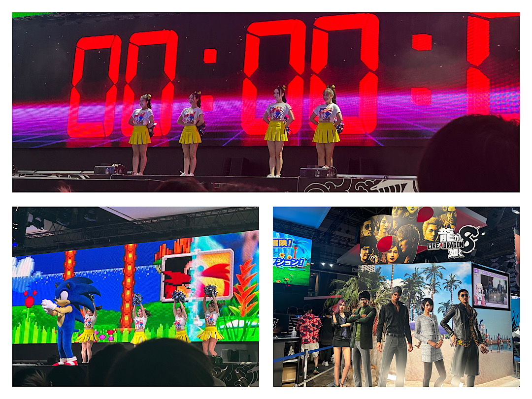 セガの方からは龍が如く8の展示です。等身大パネルの他にもフォトスポットがあったんですが、そちらは人が多くて撮影できませんでした。それと、たぶん一般の方だと思うんですが、パネルのところでコスプレイヤーさんたちが写真撮影をしていて、それがまた素晴らしかったんですよ…!ソニックのステージもちょうどやっていたので見てきました。ソニックはチアの方と踊ってさわやかに去っていきました…。