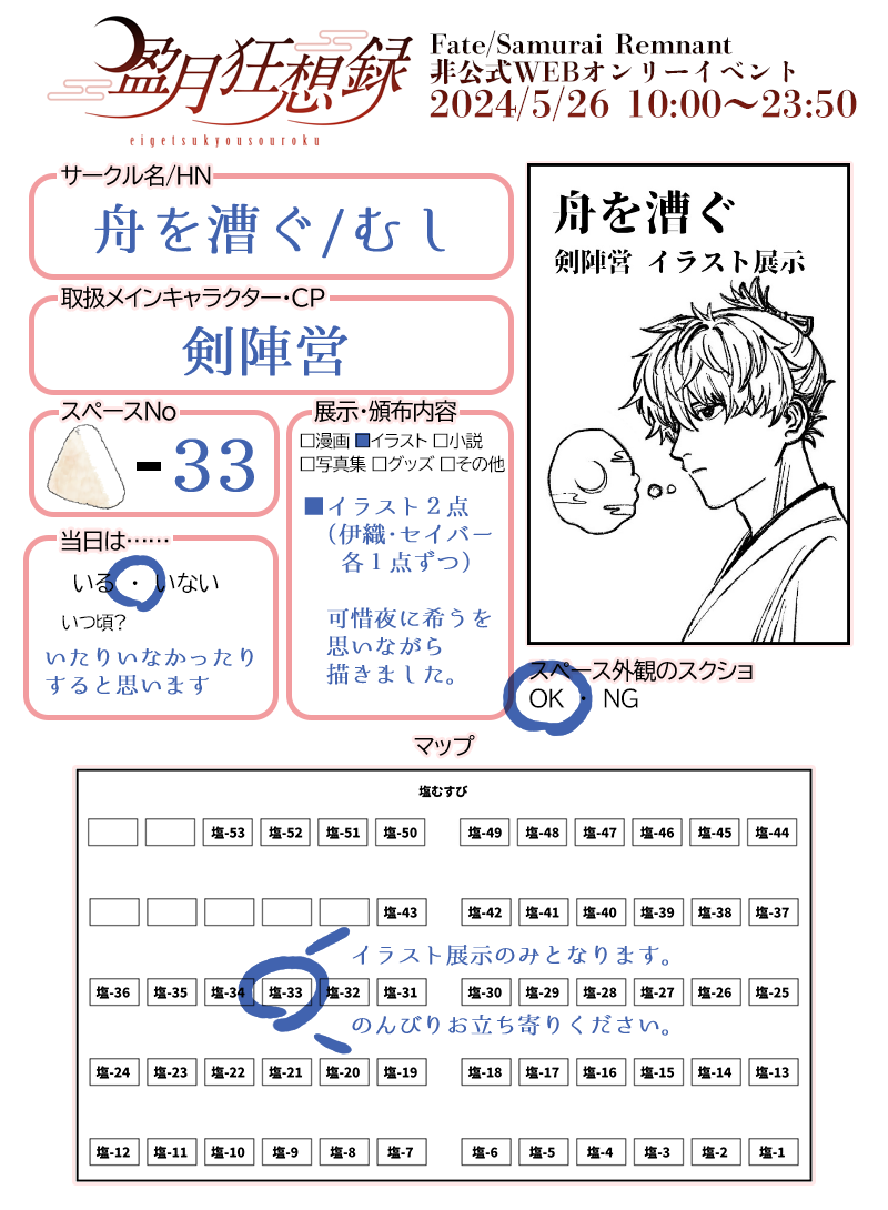 5/26に開催される盈月狂想録-Web版-にイラスト展示でサークル参加します。スペースはマップを入って中央左の「塩-33」にいただいております。ご興味のある方はよろしくお願いいたします~。
