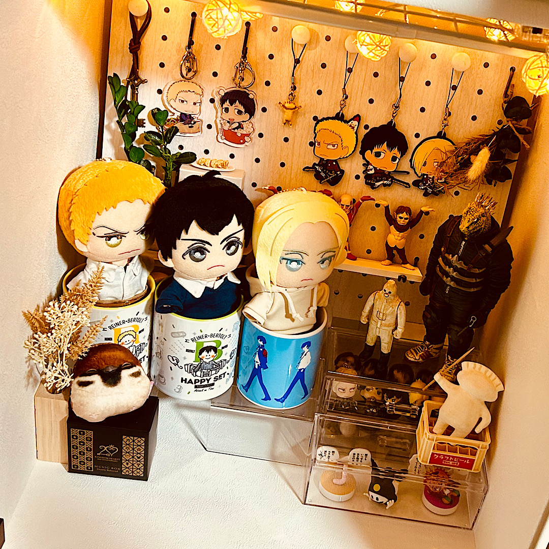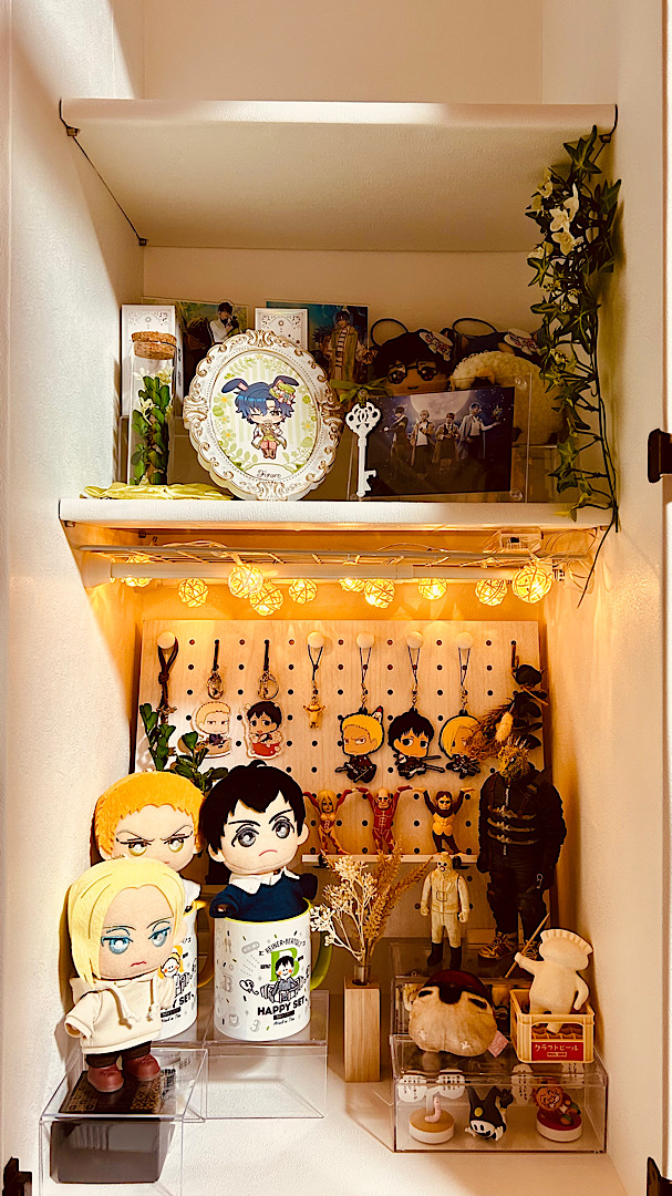 今までは一番下の段にしか置けなかったのですが、棚を一面開けてシートを貼り直しました。ジャンルごとに分けて、空いているスペースはこれから届くグッズを置く予定です。